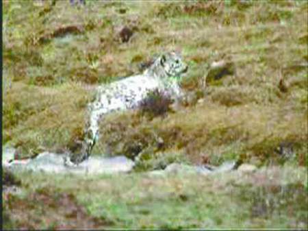 目的地距離真達(dá)鄉(xiāng)政府有四五十公里,海拔為3900米~4000米,汽車并不能直達(dá),在換乘了摩托車和馬,又步行了一段路后,一行人果然有重大收獲:大老遠(yuǎn),他們就看見(jiàn)一只雪豹趴在溝邊,借著三四十厘米高灌木的掩護(hù),他們悄悄往溝邊挪去。這只雪豹身長(zhǎng)一米多,由于距離太遠(yuǎn),相機(jī)幾乎不能發(fā)揮作用,黃勇便接過(guò)DV,將鏡頭對(duì)準(zhǔn)它,拉近、再拉近……“最近時(shí),我們和它相距只有十多米,”黃勇說(shuō),當(dāng)時(shí)他們心里發(fā)虛,好在周圍有羊的尸體,估計(jì)雪豹?jiǎng)偺铒柫硕亲,而且它在起身離開(kāi)的途中,遭遇了三頭牦牛的圍攻,旁邊還有一群馬,“馬也在攆它”。雪豹雖然早就發(fā)現(xiàn)有人一路跟隨,但無(wú)暇顧及。由于寡不敵眾,雪豹?dú)獯跤醯財(cái)∠玛,悻悻地向海拔更高的地方走去,“別看它并沒(méi)有跑,我們跟在后面卻是累得夠嗆!