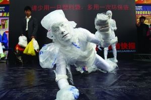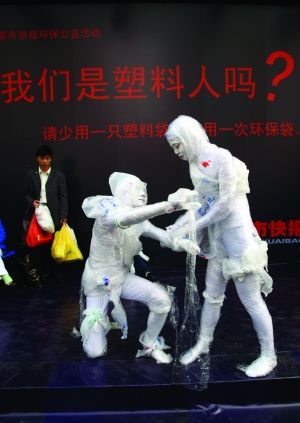 兩個(gè)被塑料袋緊緊包裹、渾身慘白的人,舉步艱難,倒在地上痛苦地掙扎;其他幾個(gè)外表正常的人,也不由自主地受到塑料袋的束縛,逐漸喪失行動(dòng)能力……昨天下午,在杭州東新園沃爾瑪超市門(mén)外的廣場(chǎng)上,一場(chǎng)由本報(bào)發(fā)起、杭州環(huán)保志愿者一起參與的、以“我們是塑料人嗎”為主題的現(xiàn)場(chǎng)行為藝術(shù),牢牢抓住了過(guò)往行人的眼球,他們圍了個(gè)里三層外三層,看清楚之后,發(fā)出這樣的驚嘆,“哦,原來(lái)是這樣的!”
