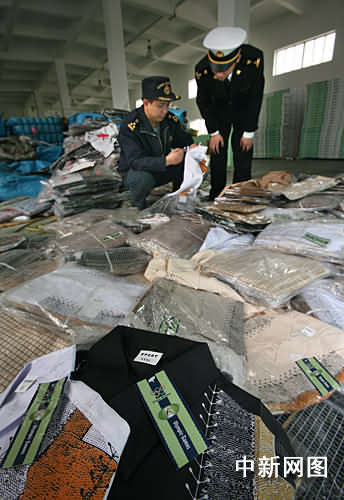 近日,廣州海關(guān)下屬番禺海關(guān)在查驗一批由深圳某商行申報出口至西非國家多哥的服裝時,發(fā)現(xiàn)這批服裝主要為各式男裝襯衣,質(zhì)地低劣,做工粗糙,在衣服標牌上卻赫然印有奧林匹克標志。(劉從新攝)