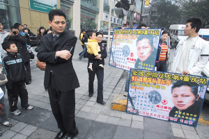 昨日下午2時許,記者在解放碑步行街看到西裝革履的毛杰東以及他的三個“征友牌牌”,征友牌約1米長、70厘米寬,上面印著毛杰東的大頭像,一旁寫著“中國搖滾領(lǐng)袖毛杰東——全國巡回征友第四站重慶站征友:范冰冰的外形、徐靜蕾的才華、林志玲的可愛、楊慧妍的財(cái)富、一千萬到一億的資產(chǎn)”等字樣。三名男青年舉著牌子在步行街游走,毛杰東則洋洋得意地走在最前面指揮。數(shù)百市民圍觀。
