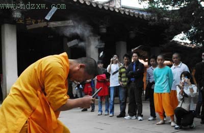 事件實錄:“哇,鐵條斷了、三根都斷了!”,在泉州南少林寺大殿廣場前,圍成一圈的觀眾群中響起了一陣陣驚嘆聲。幾分鐘前,在眾多媒體及游客面前,泉州南少林寺弟子釋振明在短暫的凝神運氣后,用頭撞向鐵板。一撞之下,三條規(guī)則疊放在一起、半米長、總厚度達1.5厘米的鐵條瞬間碎成了四五截、飛出四五米開外。在這一手高超的“鐵頭功”面前,幾位小朋友驚奇得連嘴都沒合上。