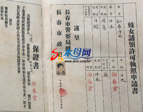 在“許可執(zhí)照申請書”另一頁,是一份保證書,保證書上有鋪保等機構(gòu)和個人的擔保,也有趙春芳本人的署名。在王師傅的攤前,記者又發(fā)現(xiàn)了數(shù)份“妓女請領(lǐng)許可執(zhí)照”,其中竟有和希沙也、高路美子等外籍女性申請在長春怡春堂為娼。(記者 王軼 實習生 馬麗娜 攝影)