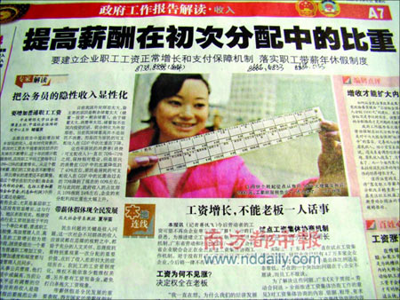 這張個稅為0的工資條圖片源于3月6日廣州一家報紙。當(dāng)時正值全國“兩會”,企業(yè)職工薪酬問題受到了人們的普遍關(guān)注,而且從今年3月份開始,個人所得稅的起征點(diǎn)由1600元調(diào)整到2000元。該報紙以“收入”為關(guān)鍵詞在A7版做了半個版的政府工作報告解讀,并特意采用了一張工資條的特寫照片作為插圖,而正是在這張圖里,工資所得者的個人所得稅一欄顯示為0.
