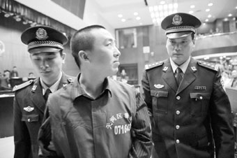 下午3時10分,待法庭書記員宣讀完法庭紀律后,宣判開始了。在三百多雙眼睛的注視下,在上百臺照相機、攝像機的聚焦下,許霆被法警押上了被告席。穿著天看(天河區(qū)看守所)1643號藍色看守服的許霆,臉上還是那么白,還是那么鎮(zhèn)定。法警解開手銬后,他端坐在法庭被告席上,雙手分開緊緊地貼在了膝蓋上。負責該案的審判長開始宣讀審判書,許霆始終目不轉(zhuǎn)睛地緊盯著他。