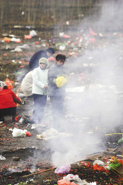 3月29日8時(shí)30分,位于石家莊市西郊的河北省雙鳳山革命陵園,緊鄰陵園的道路已是車水馬龍,在陵園設(shè)置的集中祭奠點(diǎn),紙錢燒處,人頭攢動(dòng),煙霧繚繞。稍稍有一點(diǎn)風(fēng),紙灰就會(huì)漫天飄舞。即使有人手捧鮮花來祭奠,也不忘帶上紙錢、冥幣等傳統(tǒng)祭奠品。