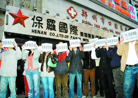 這一群由大河網(wǎng)-大河論壇的網(wǎng)友自發(fā)組成的閃客行動,在保羅國際門口舉行抗議活動。他們將寫著“很黑很后臺”的十六開紙舉在頭頂,表示他們對保羅國際的不滿。