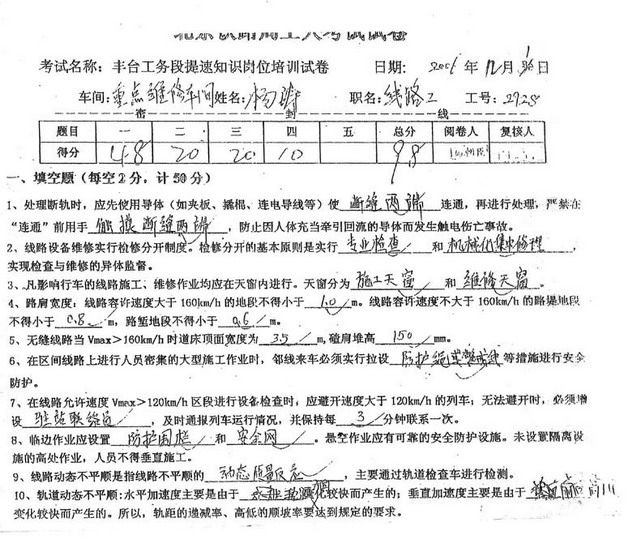 一審過程中,北京市鐵路局提供了一份試卷,法院據(jù)此認(rèn)定“從其工作狀態(tài)及崗位培訓(xùn)考試成績(jī)來看,其智力、精神狀況未受影響!睂(duì)于法院用一份試卷否定司法精神醫(yī)學(xué)鑒定結(jié)論,黃樂平律師難以理解:“在一審中,楊濤的親屬多次否認(rèn)單位遞交的試卷的真實(shí)性,并向法院遞交了楊濤的筆跡,以供一審法院查明事實(shí)。但是,法院最終還是憑這份有偽造嫌疑的試卷,推翻專業(yè)司法鑒定機(jī)構(gòu)所作的司法精神鑒定。”