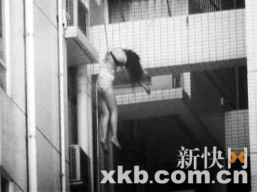 本月6日上午7時,東風(fēng)東路東風(fēng)廣場內(nèi)的清潔公司蕭姓女工第一個目睹了懸掛在該樓橫梁上的女尸。據(jù)當(dāng)時媒體公布的圖片,死者身上半裸,除了內(nèi)衣內(nèi)褲外再沒有穿其他衣物,更為恐怖的是,其尸體竟然懸掛在該廣場麗豪閣T7棟12樓和13樓之間。