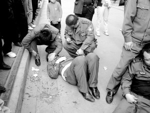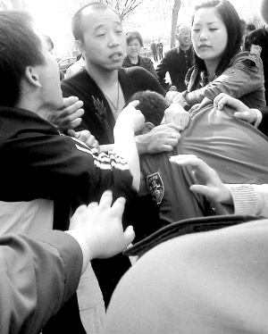13日15時(shí)25分,讀者張先生撥打本報(bào)熱線反映說(shuō),數(shù)人正圍毆執(zhí)法人員。幾分鐘后,記者趕到現(xiàn)場(chǎng),兩名執(zhí)法人員躺在地上,其中劉奇嬌已經(jīng)昏迷,旁邊有嘔吐物,同事張君毅正掐著他的人中,緊急搶救。王某在旁邊高聲叫喊:“執(zhí)法人員打人了。”然而,正在圍觀的群眾張林友讓記者看了他用手機(jī)拍的照片,生氣地說(shuō):“真是惡人先告狀,是他們喝酒后打執(zhí)法人員的!
