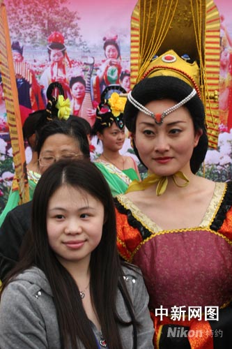 中新網(wǎng)4月19日電 (李洋)4月正是牡丹盛開(kāi)的時(shí)節(jié)!熬W(wǎng)上看河南”采風(fēng)團(tuán)18日先后探訪(fǎng)了洛陽(yáng)國(guó)際牡丹園和國(guó)家牡丹園,遍賞中國(guó)和世界的名貴牡丹品種。當(dāng)?shù)剡組織演藝團(tuán)體盛裝重現(xiàn)唐朝武則天時(shí)期的風(fēng)貌,不少女記者對(duì)武則天這一歷史人物情有獨(dú)鐘,還紛紛與“武則天”合影留念。