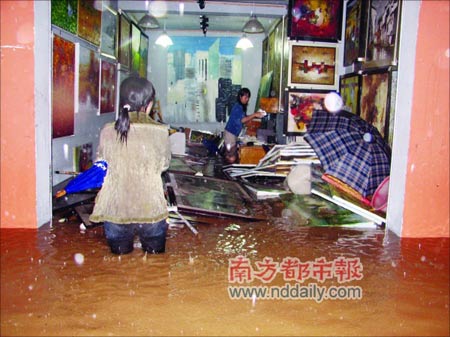 大芬村幾乎所有的畫廊都被水泡了。據(jù)初步估算損失至少超過一億元。大芬黃江廣場管理人員黃先生告訴記者,大芬村所有畫廊的經(jīng)營幾乎都沒有買保險。