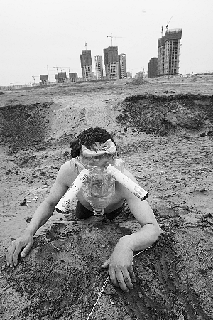 “這就是垃圾場(chǎng),我們生活的地球已經(jīng)被垃圾覆蓋,我們安睡的地點(diǎn)就在垃圾的包圍之中。”在距離宋莊鎮(zhèn)1公里遠(yuǎn)的一片空曠地,堆滿了各種垃圾廢料,在蚊蠅的環(huán)繞下,藝術(shù)家們抬來一張床,一名男子躺在床上,全身被白布包裹,上衣被人剪開后,一只鬧鐘被捆綁在左胸前,隨著鬧鐘秒針的跳動(dòng),生活在垃圾包圍中的他,生命也向“死亡”逐步靠近。