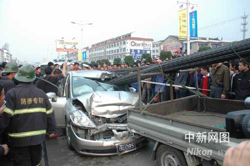 記者在事故現(xiàn)場看到,一輛裝了一大捆鋼筋的小貨車在前,霓桑小轎車緊隨其后。 小貨車上的鋼筋穿過霓桑小轎車的擋風(fēng)玻璃直插到后車駕駛室,駕駛員身上的六個不同部位被鋼筋刺穿。情況相當(dāng)危急,駕駛員隨時都有生命危險。