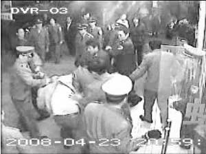 據(jù)錄像資料顯示,當(dāng)晚8點(diǎn)58分20秒左右,在收銀臺(tái)前,被城管人員圍攻的王騏嘗試自衛(wèi),還手打了其中一名城管人員。其余幾名城管人員見(jiàn)狀,一起撲上來(lái),有的按住他的脖子,有的扯住他的衣服,有的揮拳打上去。但寡不敵眾,僅幾秒鐘,五六名城管人員將王騏控制住,將其拖出小店。