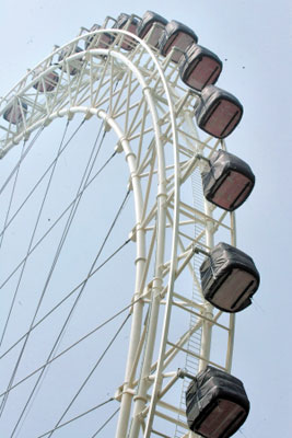 記者在施工現(xiàn)場(chǎng)看到,永樂橋摩天輪的外圈掛滿了黑色廂體,整整48個(gè),施工人員只用了兩天的時(shí)間就將它們?nèi)堪惭b到位。據(jù)介紹,在安裝座艙之前,摩天輪就已經(jīng)通過了抗壓、抗?jié)B、抗折、抗凍等強(qiáng)度試驗(yàn),并完成了電力驅(qū)動(dòng)裝置的安裝,前期準(zhǔn)備工作一切就緒,座艙運(yùn)到后立即安裝,所以才如此神速。施工人員告訴記者,座艙是完全透明的,非常漂亮,但為了避免它們?cè)谑┕み^程中受到污染及損壞,才給它們都套上了一個(gè)黑色的罩子,以起到保護(hù)的作用。