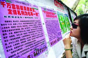 宿舍樓旁的路上,還有一些人在向來往的女生發(fā)放“征婚啟事”廣告單。多數(shù)女生坦然接受,毫不羞澀,也有一些女生捂住嘴巴,有些難為情。記者詢問一位女生對這類征婚是否感興趣,她大方地說:“我正在讀研,也是適婚年齡,他的條件的確很誘人啊,把號碼先記著,沒準也能見見面呢。”