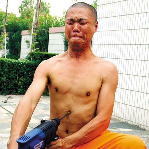 接著,胡瓊又表演沖擊鉆鉆人體。他先用通上電的沖擊鉆鉆木頭和花崗石。木石都被擊穿。然后,胡師傅把腰帶扎得更緊,扎馬下腰、氣沉丹田,大喝一聲,用雙手把高速運轉(zhuǎn)的沖擊鉆鉆向肚皮。臺下觀眾們屏住呼吸,有人蒙住雙眼不敢看。咝咝作響的沖擊鉆在胡師傅的肚皮上打轉(zhuǎn)一分鐘后,胡師傅取下沖擊鉆,肚皮竟絲毫無損。隨后,胡師傅還表演了用沖擊鉆鉆太陽穴。表演結(jié)束后,胡師傅告訴記者,他表演的電鉆鉆人體,就是民間傳說的“金鐘鐵布衫”功夫。