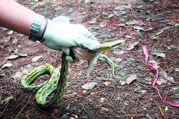 袋口剛一打開,一群蛇便爭先恐后爬出來,呼吸著山間清新的空氣,有的爬到了樹上,有的則迅速消失在草叢中……昨日,湖南省森林公安局及省林業(yè)廳森林保護站工作人員在黃花機場查獲非法運輸的1163.4公斤野生蛇類后,將其中的部分野生蛇在湖南森林植物園內現場放生。