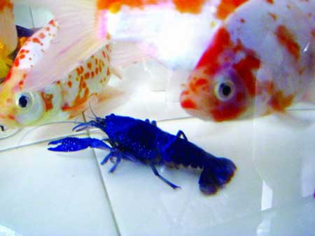 然而,由于這只龍蝦穿著罕見(jiàn)的藍(lán)色“盔甲”,與旁邊的紅色龍蝦形成了鮮明的對(duì)比。它看起來(lái)很活潑,在魚(yú)缸中和觀賞魚(yú)一起嬉戲,紅的金魚(yú)、藍(lán)的龍蝦構(gòu)成一幅漂亮的畫(huà)面。