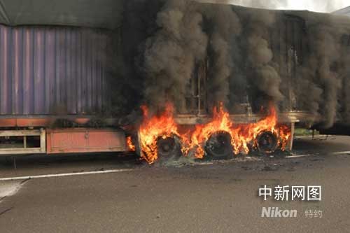 當天早晨6時許,一輛車牌為冀AF3978(掛車牌照為冀AZ747)的大貨車在京珠高速臨長路段由北往南50公里處行駛時,車輛右后胎因為摩擦突然起火。隨后,車上裝載的雞蛋的紙盒也很快燃燒起來,駕駛?cè)笋R上報警。