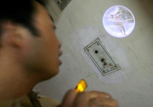 和普通的一次性打火機不同的地方,就在于在艷照打火機的機身上附帶有一個可以在墻壁上投影成像的“小電筒”。在打火機機身的側面,有一個開關,只要將開關打開,位于打火機底部的“小電筒”就會通電發(fā)光,并將一些露骨的艷照圖象投射在墻壁上。據測試,在距離燈源0.1米-1.5米的墻壁或者其他物體上都可以形成比較清晰的圖像,在0.1-1.5米之間,距離越遠,所投射出來的圖象越大。拆開打火機,可以看到在小燈泡前安裝有一個長度約2厘米的塑料圓錐管。在端口較大的一端有一塊直徑約1厘米左右的小鏡片,有放大鏡的效果,在端口較小的另一端,也有一個小鏡片,上面就印有投影出來的艷照圖片。(記者張波 黃凱)