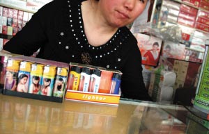 “老板,打火機多少錢一個?”記者試探著向店里的一位中年婦女詢問價格!皢钨u2元一個,如果你要的多,可以便宜點給你!敝心陭D女稱如果一次購買50個打火機,單個以1.5元出售。記者以批發(fā)大量打火機為由,想讓店鋪老板說出直接聯(lián)系打火機制造廠商的方法,但中年婦女擔心生意被搶,堅決不肯透露任何信息!澳銈円I可以先付訂金給我,我打電話給賣火機的人預定,你們要多少都可以!钡曛髡f艷照打火機也是最近才進的貨,還比較好銷,生意好的時候一個月能賣出50個左右。看記者拿著火機觀察了一陣并沒有購買的意思,店主開始有些警覺起來,打算將裝有艷照打火機的盒子收起來。“如果想批發(fā)可以來找我。”