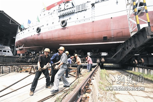 上午9時(shí),位于白沙洲的武漢南華高速船舶工程股份有限公司內(nèi),21臺移船小車在絞索的牽引下,沿鋼軌緩緩將中山艦送到移船大車上。約10:10,移船大車在四臺牽引機(jī)車牽引下,載著中山艦沿著南華公司的滑道,向江邊駛?cè)ァ?/p>