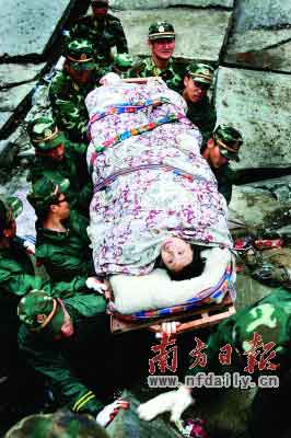 14日,北川縣城的大規(guī)模搜救進入第二天,進行救援的紅軍師裝甲團官兵告訴記者,與前一天不同,他們今天將展開拉網(wǎng)式排查。而在一片斷壁殘垣的北川縣,在一片黑暗的廢墟下,許多受困群眾在不屈不撓地與死神作斗爭,并最終贏得了生存的希望。