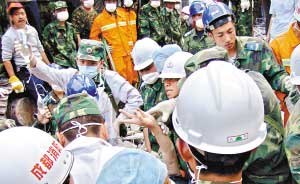 下午1時40分許,記者在現(xiàn)場看到,廣東消防官兵攜帶生命探測儀等高科技救援設備趕赴現(xiàn)場。在周圍十余幢倒塌的樓房廢墟范圍內(nèi),廣東400名救援官兵有條不紊地進行救援活動,戰(zhàn)士們穿著厚厚的救生衣,雖然滿頭大汗,但沒有一個人在有可能再次坍塌的樓房廢墟中退卻。