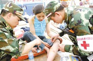 15日16時(shí),廣東邊防六支隊(duì)醫(yī)療小分隊(duì)得知有4名被困學(xué)生急需救助后迅速趕往救援地點(diǎn)。有4名學(xué)生正通過(guò)亂石中的一條縫隙向外呼救,此時(shí)距離他們被困已超過(guò)75小時(shí)。被困4名學(xué)生被一一救出。廣東邊防六支隊(duì)官兵立即將他們抬上擔(dān)架送往戰(zhàn)地醫(yī)院救治。15日晚上,在地震發(fā)生80小時(shí)內(nèi),廣東邊防六支隊(duì)醫(yī)療小分隊(duì)在漢旺鎮(zhèn)東汽中學(xué)的廢墟中成功救出4名被困中學(xué)生。