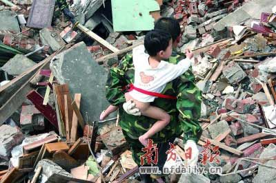 昨日下午5點,記者第三次深入北川縣城核心現(xiàn)場,發(fā)現(xiàn)一股從背后深山逃出的人流。他們的眼神充滿對親人的依戀,生怕再次分開。11歲的張吉萬背著3歲半的妹妹張韓,非常吃力地走著。同行的爺爺、奶奶已經(jīng)老了,父母在外打工,小吉萬就勇敢地擔(dān)負起小男子漢的責(zé)任。早上5點出發(fā),已經(jīng)走了12個小時了。小吉萬說,他很愛妹妹。