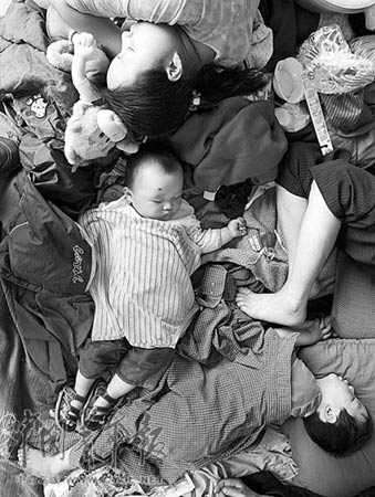 劉碧樹的妻子環(huán)顧四周,看到很多孩子和父母都在露天打地鋪,眼圈一下紅了:“小孩子不能洗澡,又天天吃這些方便食品,怎么行啊?”