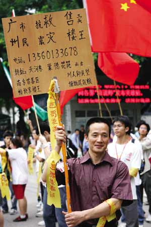 昨日,有一個(gè)人,隨著號(hào)召募捐行動(dòng)的志愿者隊(duì)伍,從正佳廣場(chǎng)西北門的活動(dòng)現(xiàn)場(chǎng)一直跟到另一主會(huì)場(chǎng)僑鑫教育大院。他始終默默站著,沒(méi)和任何人說(shuō)話;而他手上,則舉著一塊自己制作的簡(jiǎn)陋牌子,上面寫著“廣州市民抗震救災(zāi)售賣樓王”,引來(lái)好多路人觀望。