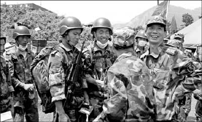 5月16日上午7點(diǎn),一支配備著廣州軍區(qū)武漢總醫(yī)院兩名專家、一名政治部主任和一名干事、空降兵15名官兵、兩枝槍的19人小分隊(duì),在向?qū)У膸ьI(lǐng)下,從紅白鎮(zhèn)出發(fā),背上背著僅夠兩天的水和食物,徒步前去偵察救援。