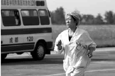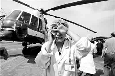昨天下午4點05分,東方通用航空公司的一架米1-71直升機緩緩降落在廣漢機場停機坪上。艙門打開,40歲的女護士杜娟下了飛機,招呼著成都120急救中心的醫(yī)護人員將傷員抬到急救車上。杜娟是北川縣禹里羌族鄉(xiāng)衛(wèi)生院的護士。5·12地震后,禹里與世隔絕,直到昨天才等到直升機將重傷者送出。杜娟隨機照顧患者。傷員都下了飛機后,杜娟向于波借手機,電話打通時,她手開始顫抖,撕心裂肺的哭聲終于無法忍住。那是她六天后,第一次給外面的親人打電話。巨大的螺旋槳轉動聲中,人們只能依稀聽到她的哭訴:“我要去找他,不能連個尸體都沒有!庇诓乜粗,不到一個小時前,他還覺得這個女護士嚴厲得有點過分。