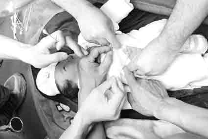 9點35分,記者再次回到岷江大壩旁的主干道。從映秀方向出來的老鄉(xiāng)逐漸增多。在一座橋旁,從湖北宜興遠(yuǎn)道而來的李先生靠著祖?zhèn)鞯乃幏胶褪炙,為受傷的人進行及時治療。