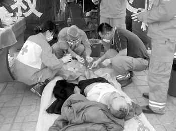由于前一天余震比較強烈,開放了2天的手術(shù)室再次關(guān)閉。18日,彭州市人民醫(yī)院只能在一樓騰出一間房作為臨時手術(shù)室。在簡陋的條件下,剛做完一場艱苦的手術(shù),中南大學湘雅二醫(yī)院的幾名醫(yī)生十分疲憊!搬t(yī)生,你們受累了,自己要保重!53歲的黃姓女傷員一句貼心的話,讓醫(yī)務(wù)人員感到很欣慰。