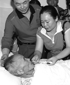 送到醫(yī)院后,老人已陷入昏迷,十多名醫(yī)護(hù)人員立即將老人推進(jìn)病房急救。3名護(hù)士更是守在病床旁連續(xù)呼喊“爺爺,爺爺!”,以對其模糊的意識(shí)進(jìn)行刺激。用藥2小時(shí)后,老人奇跡般蘇醒過來。不料老人卻對著醫(yī)護(hù)人員大聲呼喊“我沒有病,我要離開,你們滾!”張貴清趕緊上前握住爺爺?shù)氖,“爺爺,我在這里呢?”見到孫子在,老人才平靜下來!盃敔敾加欣夏臧V呆,他只認(rèn)得到我,所以見到醫(yī)護(hù)人員才會(huì)破口大罵。我感到很不好意思,熱情的重慶醫(yī)護(hù)人員受委屈了!”昨天,張貴清面對醫(yī)護(hù)人員深深鞠躬以表謝意和歉意。(記者 陳宇)