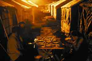 2008年5月19日晚,都江堰一正在分批搭建的臨時災民安置區(qū),災民在帳篷外面的空地吃飯。攝影(除署名外) 記者 王申