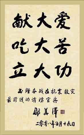 中國記協(xié)名譽主席邵華澤題字贊抗震消防官兵(圖)