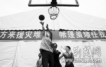 籃球場還有一個(gè)籃球架和五分之一個(gè)場地空著。傍晚7時(shí),14歲的北川縣漩坪中學(xué)初一學(xué)生張俊林,和幾個(gè)伙伴一起打起籃球。他說,他的家毀了,但沒有人受傷,他現(xiàn)在一家5個(gè)人與其他三家人一起住在一個(gè)大帳篷里,他現(xiàn)在最盼望的是快點(diǎn)回到真正的教室上課。(特派記者 韋忠南 張泉 陳世昌)