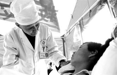 5月13日早上,什邡市第二人民醫(yī)院院內(nèi)的空地上臨時救治帳篷內(nèi),傷者正在吃著醫(yī)院分發(fā)的牛奶和雞蛋,1樓門過道也擠滿了受傷群眾的家屬。而過道上的另外一幕卻格外讓人感動:一張凳子旁邊立著一根鐵棒,鐵棒上掛著一瓶裝滿藥水的輸液瓶,一個身穿白大褂、頭發(fā)斑白、面容清瘦的醫(yī)生正在進行輸液治療。他就是累倒在手術(shù)臺,心跳停止長達1分鐘的張泮林教授!拔覀兌紕袼谂R時救治帳篷中進行治療,不要在外面,他堅決不干。他說,很多受傷群眾需要立即治療,不能占用病床!痹槲湔f,張泮林家在成都,他一個人在這里沒有人照顧,醫(yī)院提出找護士照顧他時,他也沒有同意。