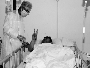 昨日清晨7點(diǎn),經(jīng)過(guò)手術(shù)后的短時(shí)間恢復(fù),護(hù)士為馬元江送來(lái)了他獲救后的第一餐稀飯,護(hù)士小心翼翼地將50毫升的粥慢慢地喂他喝下。到了中午12點(diǎn)和下午3點(diǎn),又分別喂他喝下了各50毫升的營(yíng)養(yǎng)液。昨日下午6點(diǎn),馬元江看到醫(yī)生和記者在隔離區(qū)探望時(shí),忽然做出了一個(gè)勝利的手勢(shì),讓在場(chǎng)的人非常感動(dòng)。