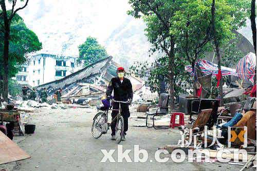 劉相宇第二次進(jìn)映秀時(shí)撿了一輛自行車查看災(zāi)情。