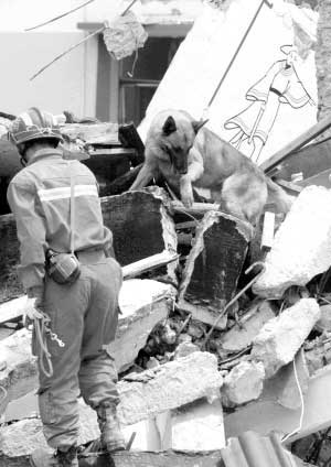 “行動”,賈樹志一聲令下,四只“戰(zhàn)神”立即沖向廢墟堆里,在訓導員的牽引下,不停地來回穿梭,只要有空隙的地方,它都會伸長了脖子往里嗅。半個小時之內,四只搜救犬圍著廢墟整整轉了兩個來回之后,便耷拉著腦袋從廢墟上下來,一副失望的神情。