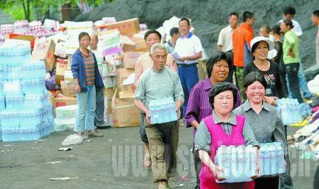 記者隨洛水鎮(zhèn)黨委副書記、發(fā)放救災(zāi)物資的指揮長宋德芝走進政府大院。大院門口由武警把守,這里是洛水鎮(zhèn)收發(fā)救災(zāi)物資點。大門口的右側(cè)放著礦泉水,堆積如山;旁邊是食品,而幾間房子里堆放的是被套!耙蚴瞻l(fā)點改了,現(xiàn)在這里不再接收救災(zāi)物資,只需將救災(zāi)物資全部發(fā)放!彼贿呎f,一邊忙著清點大院的東西。