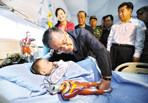 5月23日,溫家寶總理專程到綿陽404醫(yī)院監(jiān)護(hù)室看望了3歲的小郎錚,稱贊他“堅強(qiáng)、勇敢”。