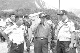 坐下來的時候,已經(jīng)有幾個漢子圍坐著在狼吞虎咽地吃飯。這幾個漢子,一個個皮膚黝黑,額頭大塊脫皮,眼泡腫脹。一個尤為烏黑消瘦的漢子用嘶啞的聲音招呼我們多吃點(diǎn)。聽旁邊的人介紹,才知道這個漢子是四川省公安廳政治部主任、阿壩州抗震救災(zāi)指揮部副總指揮簡勝彬。記者簡直不敢相信自己的眼睛。因?yàn)楣ぷ麝P(guān)系,我們對他再熟悉不過了。但是,坐在對面幾分鐘了,竟然沒能認(rèn)出他來。連續(xù)在救災(zāi)現(xiàn)場奔忙了9天多,沉痛的心情、繁重的抗震救災(zāi)工作任務(wù)、惡劣的自然環(huán)境、簡陋的生活條件已經(jīng)讓他完全變了樣。