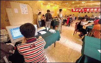 廖明艷是北川縣委宣傳部的工作人員,她的“辦公室”是70余平方米大廳的一角,地震前是賓館的火鍋廳。一張長(zhǎng)形餐桌旁放了一圈椅子,上面用小紅牌寫著“宣傳部”、“廣電局”、“人事局”。