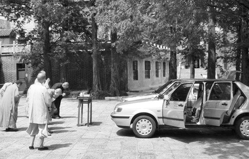 4月23日,星期三,一名網(wǎng)友在該山某寺門口發(fā)現(xiàn)兩輛掛著株洲牌照印有“衛(wèi)生監(jiān)督”字樣的車正在“開(kāi)光”,兩輛車的所有車門和尾箱打開(kāi),儀式非常隆重。